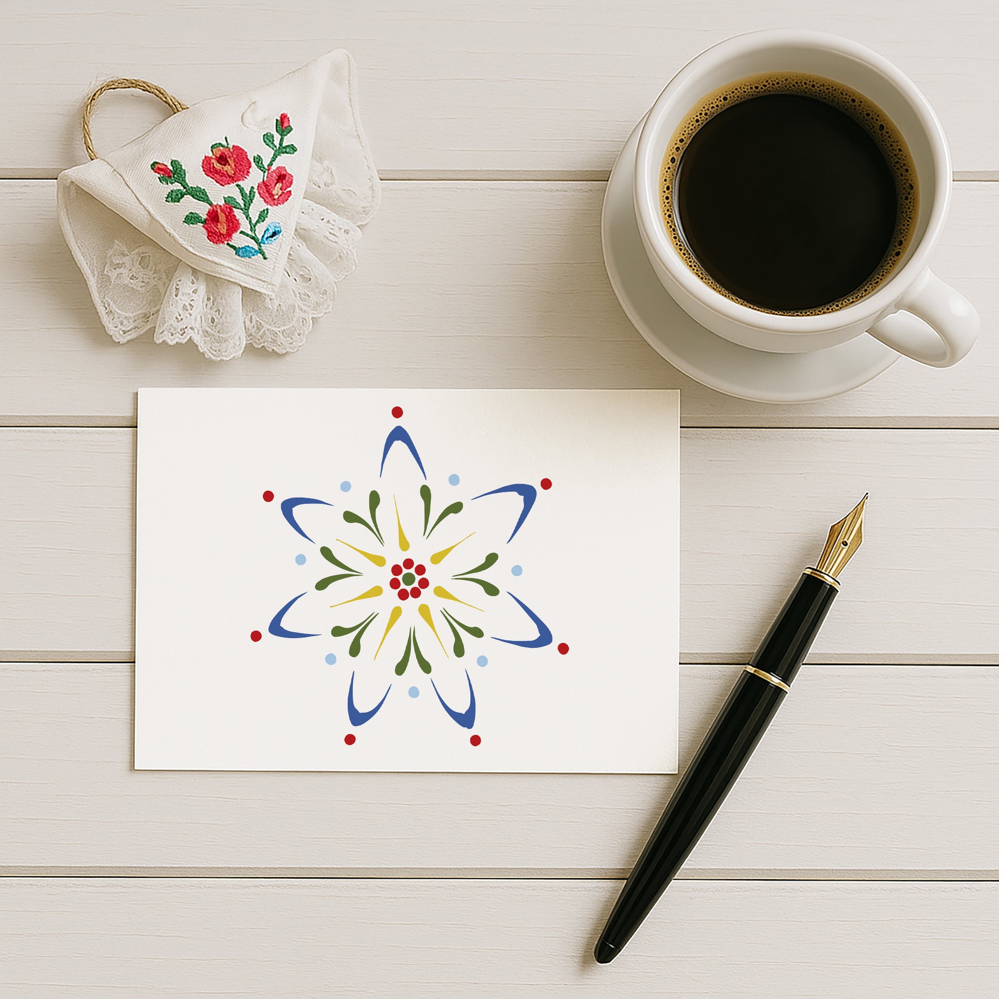 Zart, symmetrisch, voller Anmut – das Postkartenset „Sorbische Blüte“ bringt die Magie sorbischer Volkskunst auf edles Papier. Die sternförmige Blume, inspiriert von traditionellen Ostereiermotiven und Stickmustern, zeigt sich in fünf Farbvariationen: von klassisch Blau-Weiß über frühlingshaft bunt bis herbstlich warm.