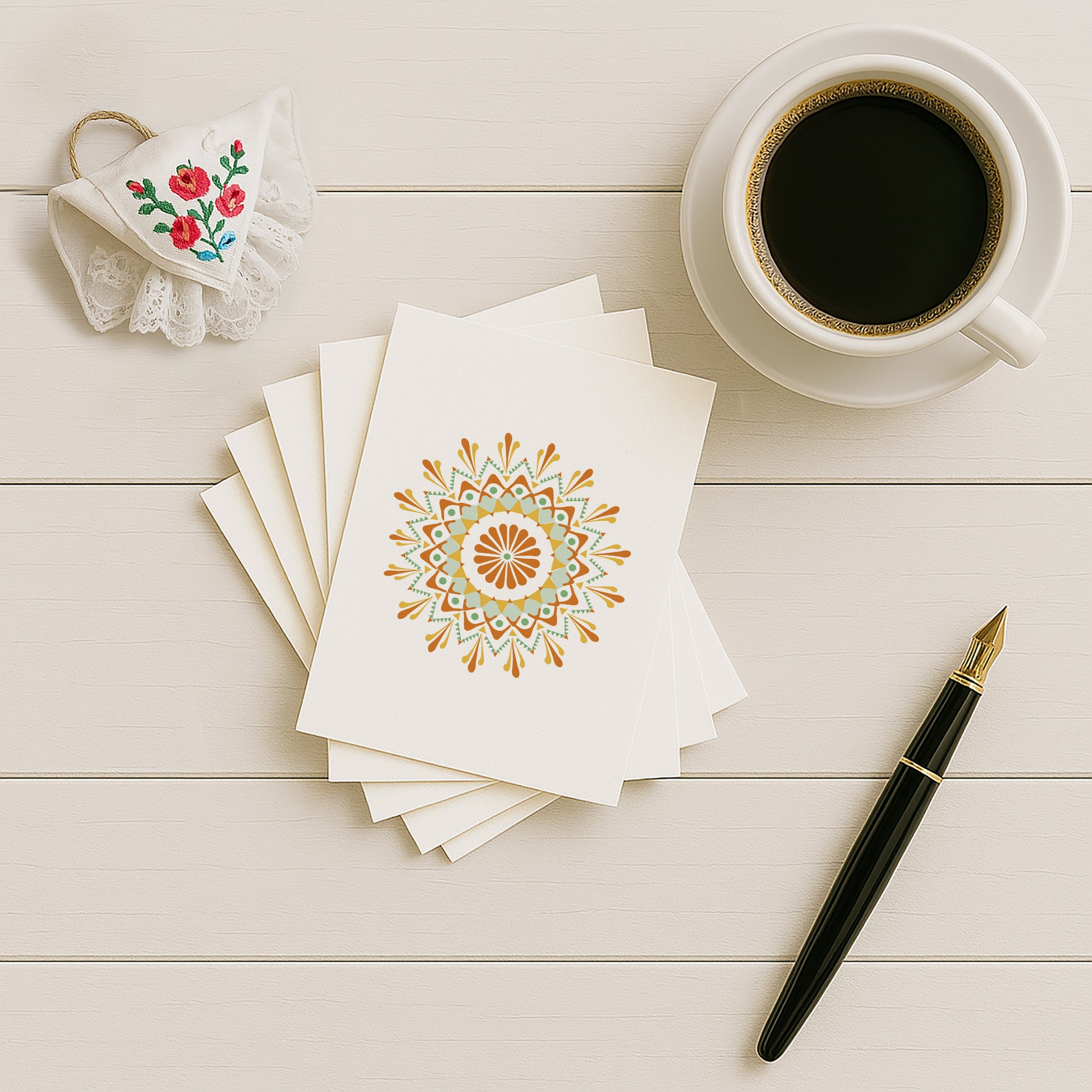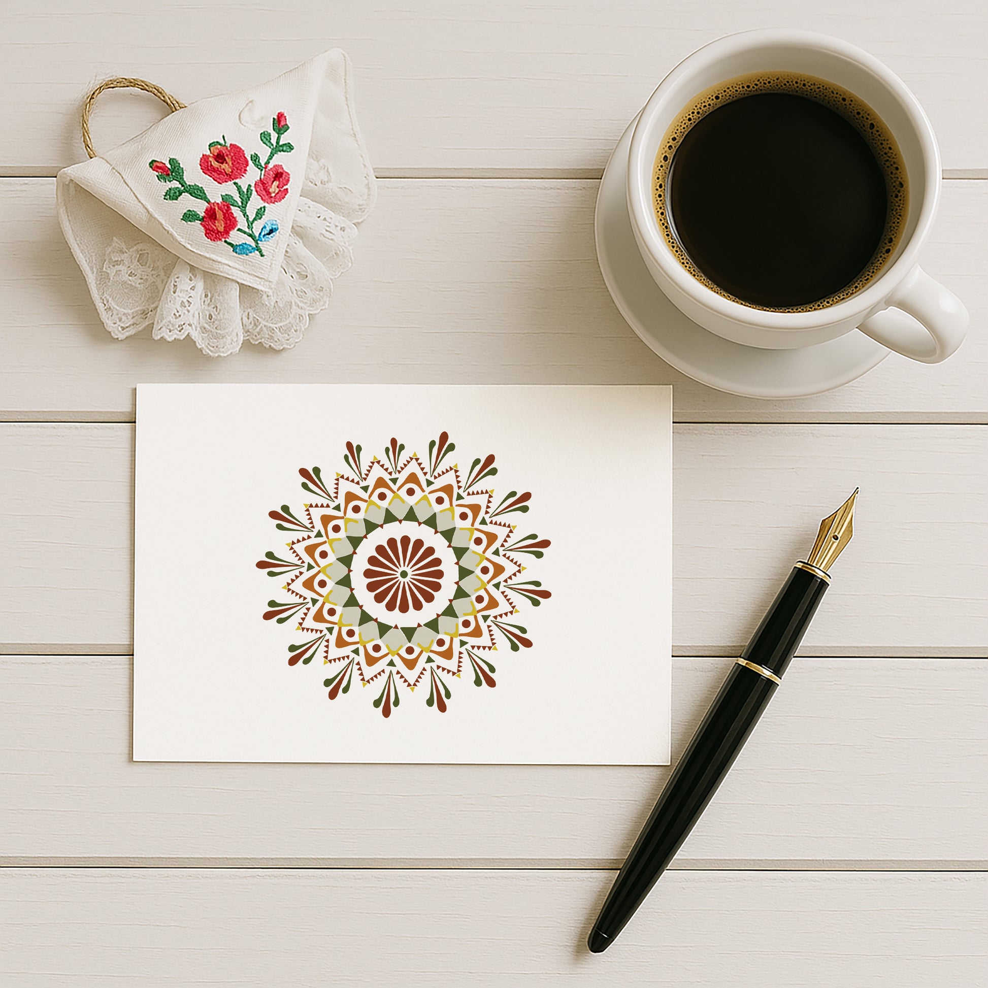 Inspiriert von der traditionellen Ornamentik der Lausitz, vereint das Set „Stern“ fünf detailreiche Karten mit sternförmigen, symmetrischen Mustern. Ob in kühlen Blautönen, warmen Herbstfarben oder leuchtendem Rot-Grün – jedes Design strahlt auf seine Weise Ruhe, Schönheit und sorbische Identität aus.